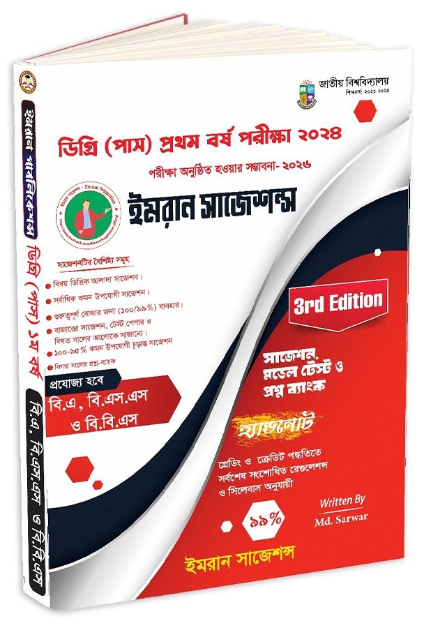 জাতীয় বিশ্ববিদ্যালয়ের ডিগ্রি (পাস) প্রথম বর্ষের শিক্ষার্থীদের চূড়ান্ত প্রস্তুতির জন্য ‘ইমরান সাজেশন্স’ (৩য় সংস্করণ)। বি.এ, বি.এস.এস এবং বি.বি.এস শাখার শিক্ষার্থীদের জন্য বিশেষভাবে রচিত এই বইটিতে রয়েছে হ্যান্ডনোট, মডেল টেস্ট এবং বিগত সালের প্রশ্ন ব্যাংক। ১০০% থেকে ৯৫% কমন পড়ার নিশ্চয়তা সহ সহজ ও সাবলীল ভাষায় রচিত।
